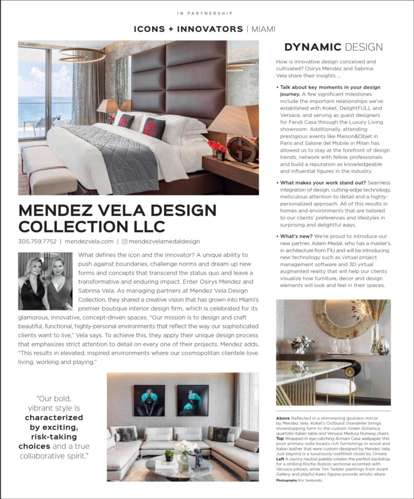What defines the icon and the innovator? A unique ability to push against boundaries, challenge norms and dream up new forms and concepts that transcend the status quo and leave a transformative and enduring impact. Enter Osirys Mendez and Sabrina Vela. As managing partners at Mendez Vela Design Collection, they shared a creative vision that has grown into Miami’s premier boutique interior design firm, which is celebrated for its glamorous, innovative, concept-driven spaces. “Our mission is to design and craft beautiful, functional, highly personal environments that reflect the way-out sophisticated clients want to live,” Vela says. To achieve this, they apply their unique design process that emphasizes strict attention to detail on every one of their projects. Mendez adds, “This results in elevated, inspired environments where our cosmopolitan clientele love living, working and playing.”